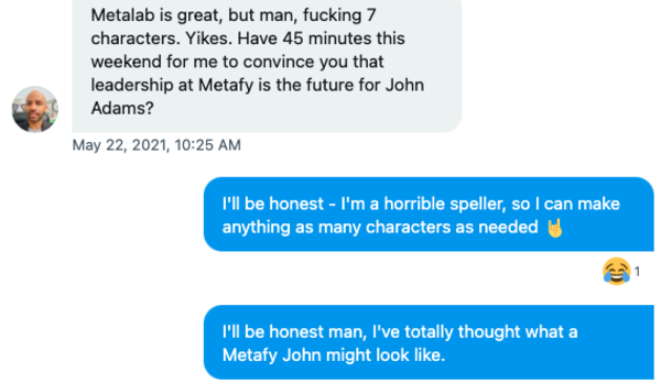 So I applied. And then crossed my arms, tapped my foot, and stared at my inbox for the next 72 hours. Nothing. I didn’t have time for this. So I DM’ed Josh on Twitter, shared some of my work, and said I’d really like to talk. To my delight, he responded and we were on the phone for a quick 30 minute check-in the next day. That 30-minute check-in turned into an hour-and-a-half deep dive and total geeking out about what Metafy is doing now, and will be doing soon. The problems to solve are complicated and incredibly difficult, which is exactly what I want. Josh totally sold me on the vision then, and I remain increasingly more sold on the vision and Josh’s ability to deliver every day since then.