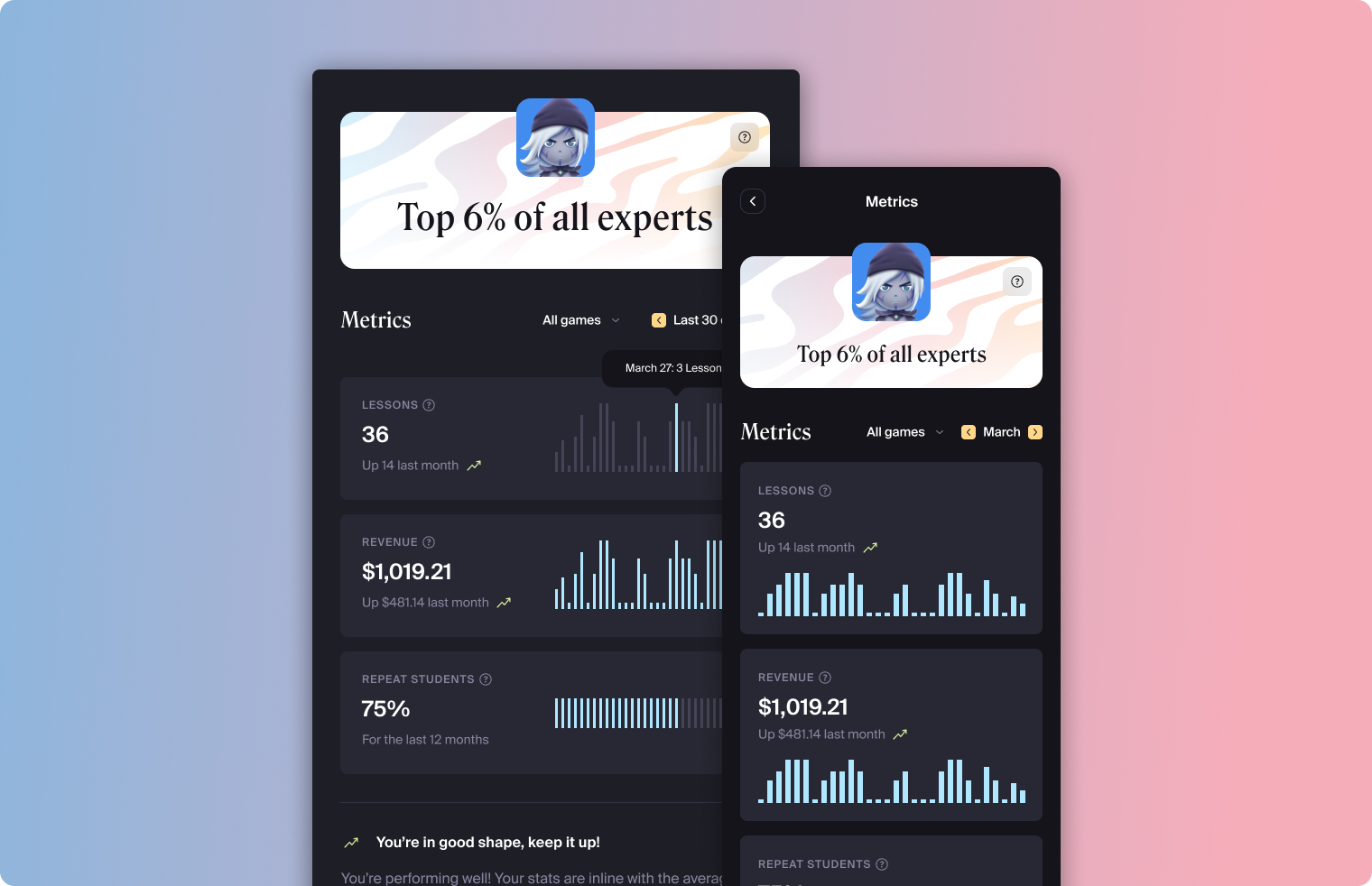 Finally, we gave Experts some other new tools to manage their business. These are things they've been asking for, including more control over their lesson availability as well as stronger protection against last-minute cancelation and reschedules from their students (which has been universally praised)