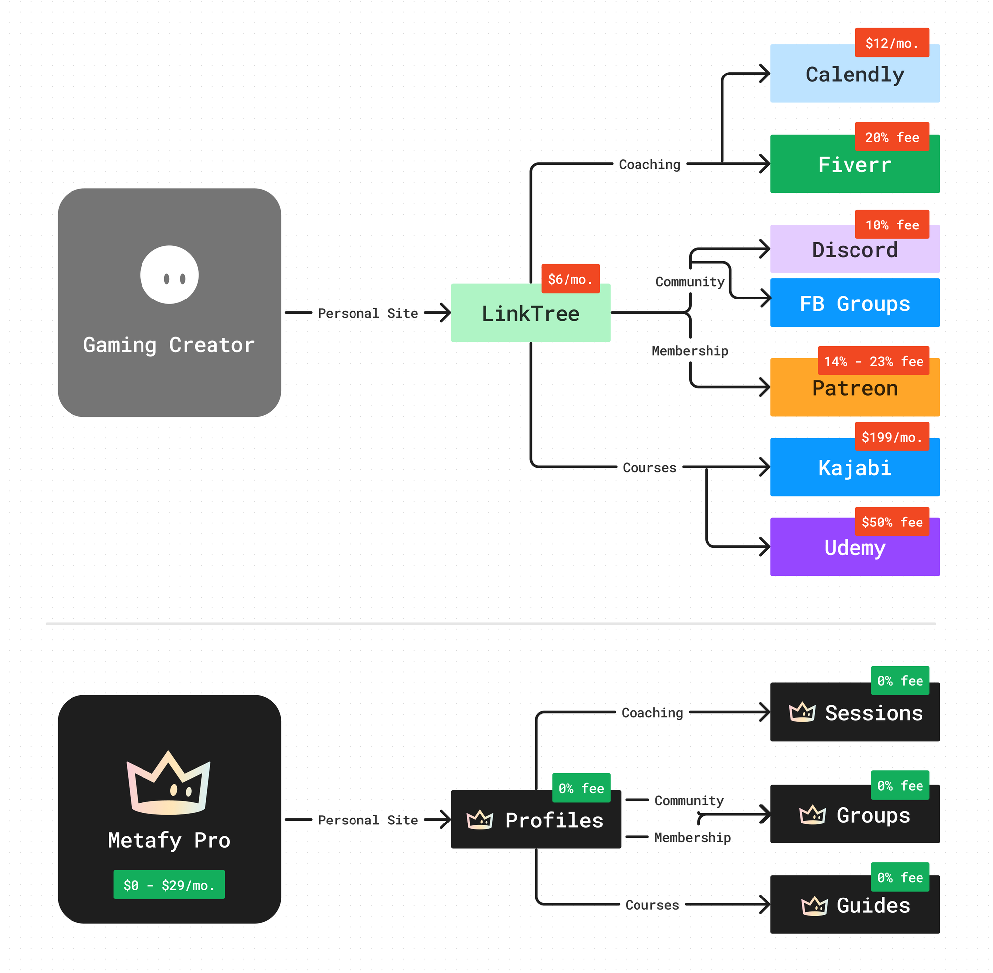 I want you to think about how monetization happens today. Right now, if you're a gamer that's making real money, you're probably using Linktree for your bio, Fiverr for coaching, Udemy for courses, and Patreon for your community. That's four different platforms, four different logins, four different fee structures.