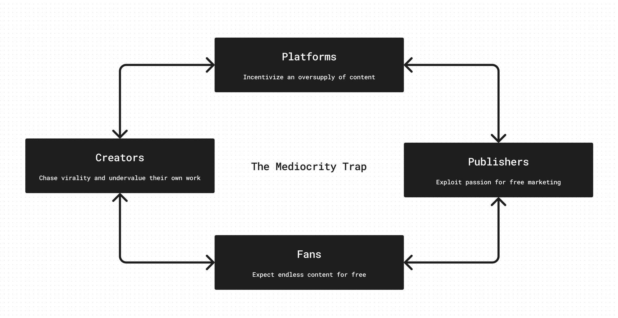 The creator economy, for all its promise, has a fundamental flaw. I call it the Mediocrity Trap. That's right, more made up terminology. This trap is a natural consequence of the perverse incentive structures in the current creator ecosystem.